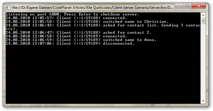 EinführungDieser Artikel basiert im Wesentlichen auf dem Tutorial „TCP/IP Socket-Programmierung in C#“ und setzt die dort vermittelten Kenntnisse in ein fortschrittliches Client-Server-Modell um. Ziel ist es mithilfe eines Clienten Daten von einem entfernten Server abfragen zu können. Der Server soll diese Daten an einen oder mehrere Clienten gleichzeitig senden können und somit asynchron arbeiten. Die Daten liegen als XML-Dokument vor und werden vom Server nur bei Bedarf „on the fly“ übermittelt. Damit wird zum einen gezeigt, wie sich die Belastung für den Server im Upstream senken lässt und zum anderen eröffnet es die Möglichkeit die Funktion von einfachen Netzwerkprotokollen zu demonstrieren. Netzwerkprotokolle sind exakte Vereinbarungen, nach der Daten zwischen Computern bzw. Prozessen ausgetauscht werden, die durch ein Netz miteinander verbunden sind. Chatprogramme und auch Browser greifen auf Protokolle zurück, um im Internet zu kommunizieren. Als Beispiel wurden in diesem Artikel Kontaktdaten von natürlichen Personen gewählt. Diese Daten werden in einem XML-Dokument gespeichert und vom Server an die Clienten übertragen. Da der Server im Zentrum des Netzwerks steht, kann er Ressourcen verwalten, die allen Usern gemeinsam sind, um Probleme der Redundanz und Widersprüchlichkeit zu vermeiden. Die Clienten können die Kontaktliste vom Server empfangen und auch mit verschiedenen Befehlen detaillierte Daten aus der Kontaktliste abfragen. Das Projekt wurde mit Microsoft Visual Studio und dem .NET Framework 4.0 realisiert. ![]() XMLXML ist eine Auszeichnungssprache zur Darstellung hierarchisch strukturierter Daten in Form von Textdaten. XML wird u. a. für den plattform- und implementationsunabhängigen Austausch von Daten zwischen Computersystemen eingesetzt, insbesondere über das Internet. Die Extensible Markup Language wurde in einem Standard vom World Wide Web Consortium (W3C) spezifiziert. Die vom W3C herausgegebene XML-Spezifikation (Recommendation, erste Ausgabe vom 10. Februar 1998, aktuell ist die fünfte Ausgabe vom 26. November 2008) definiert dabei eine Metasprache, auf deren Basis durch strukturelle und inhaltliche Einschränkungen anwendungsspezifische Sprachen definiert werden. Diese Einschränkungen werden durch Schemasprachen wie DTD oder XML Schema ausgedrückt. Beispiele für XML-Sprachen sind: RSS, MathML, GraphML, XHTML, XAML, Scalable Vector Graphics (SVG), aber auch XML-Schema. Die Webtechnologie Ajax ist heute im Internet oft anzutreffen und basiert ebenfalls auf XML. Ajax ist ein Apronym für die Wortfolge „Asynchronous JavaScript and XML“. Es bezeichnet ein Konzept der asynchronen Datenübertragung zwischen einem Browser und dem Server. Dieses ermöglicht es, HTTP-Anfragen durchzuführen, während eine HTML-Seite angezeigt wird, und die Seite zu verändern, ohne sie komplett neu zu laden. KontaktlisteIn dem Client-Server-Modell soll der entfernte Server Kontaktdaten übertragen, die in einem XML-Dokument lokal abgespeichert sind. In diesem Dokument kann eine Stelle zu beliebigen Zeitpunkten Kontakte hinterlegen und die Clienten können anschließend diese Kontakte von überall auf der Welt abfragen. Wichtig für die Übertragung der Daten ist das sowohl Server als auch Client wissen welche Daten überhaupt vorhanden sind. Die Beschreibung der Kontaktliste mit den Elementen ist daher der erste logische Schritt bei dem Entwurf der Applikation. Typisch für ein XML-Dokument ist das es aus Textzeichen besteht, im einfachsten Fall ASCII, so dass es damit menschenlesbar – Binärdaten enthält es per Definition nicht - wird. XML-Dokumente besitzen einen physischen und einen logischen Aufbau. Der logische Aufbau entspricht einer Baumstruktur und ist damit hierarchisch organisiert. Als Baumknoten gibt es Elemente, deren physische Auszeichnung mittels einem passenden Paar aus Start-Tag ( Ein einzelner Kontakt in dem Programm besteht aus der Identifikationsnummer des Mitarbeiters, kurz Id, dem Namen, der Firma bei der der Mitarbeiter angestellt ist, seiner Adresse, der E-Mail, der Telefon-, Fax- und Handynummer, der Anrede, dem Titel und der Position innerhalb des Unternehmens. Nachfolgend ist so eine Kontaktliste mit drei Beispielkontakten aufgelistet. <Contacts xmlns="http://tempuri.org/Contacts.xsd"> <Kontakte> <Id>1</Id> <Name>Stefan Müller</Name> <Firma>Lufthansa AG</Firma> <Adresse>Elfenbeinstrasse 25, 80935 München</Adresse> <Email>stefanmueller@mail.de</Email> <Telefon>98362550</Telefon> <Handy>01746352423</Handy> <Fax>98362551</Fax> <Anrede>Herr</Anrede> <Titel>Dipl.-Ing. (FH)</Titel> <Position>Abteilungsleiter</Position> </Kontakte> <Kontakte> <Id>2</Id> <Name>Barbara Bauer</Name> <Firma>BMW</Firma> <Adresse>Burgstrasse 2, 14935 Berlin</Adresse> <Email>barbara@bmw.de</Email> <Telefon>82272550</Telefon> <Handy>017463764254</Handy> <Fax>0892272573</Fax> <Anrede>Frau</Anrede> <Titel>Dr.</Titel> <Position>Mitarbeiterin</Position> </Kontakte> <Kontakte> <Id>3</Id> <Name>John Doe</Name> <Firma>Doe Inc.</Firma> <Adresse>Evergreen 345, 10101 New York</Adresse> <Email>john@doe.de</Email> <Telefon>10001</Telefon> <Handy>10002</Handy> <Fax>10003</Fax> <Anrede>Herr</Anrede> <Titel>Prof.</Titel> <Position>Dozent</Position> </Kontakte> </Contacts> Damit wären die Daten beschrieben, die im Client-Server-Modell ausgetauscht werden sollen. NetzwerkprotokollEin Netzwerkprotokoll im Prinzip eine Vereinbarung aus einem Satz von Regeln und Formaten (Syntax), die das Kommunikationsverhalten der kommunizierenden Instanzen in den Computern bestimmen (Semantik). Das Internet basiert auf dem OSI-Schichtenmodell, das die Aufgaben der Kommunikation in sieben aufeinander aufbauende Schichten unterteilt. Für jede Schicht existiert eine Beschreibung, in welcher steht, was diese Schicht zu leisten hat. Diese Anforderungen müssen von den Kommunikationsprotokollen realisiert werden. Die konkrete Umsetzung wird dabei nicht vorgegeben und kann daher sehr unterschiedli
